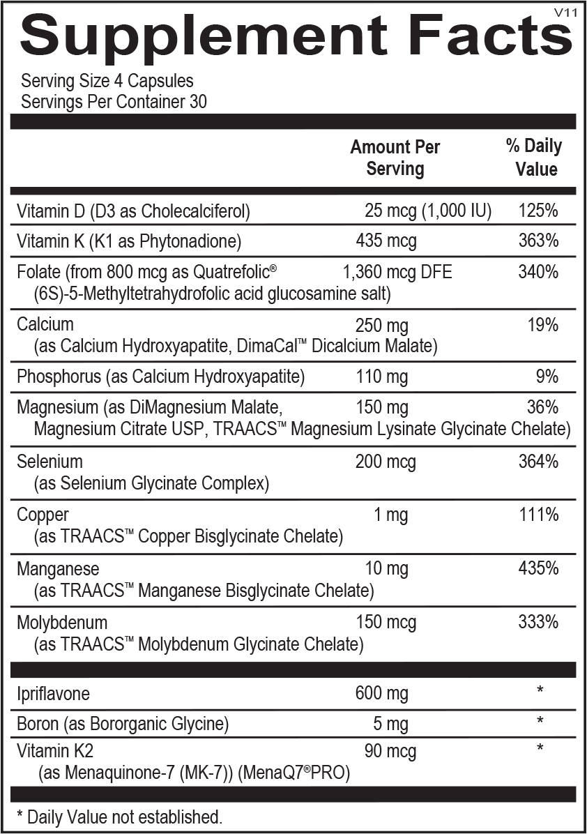 Bone mineral density (BMD) is a major determinant of bone mass and is the most commonly measured quality of bone. A number of factors contribute to BMD including lifestyle factors (regular physical activity, not smoking, minimizing stress levels) and maintaining hormonal balance. Consuming a healthy diet and ensuring optimal levels of bone-building vitamins and minerals are key strategies for preserving bone strength. OsteoPrev is a formulation specifically designed to promote healthy bone density. OsteoPrev contains Albion® TRAACS® chelated minerals for enhanced bioavailability including calcium, magnesium, copper, manganese and molybdenum. OsteoPrev also includes vitamins D and K and phytonutrients to support bone health and increase skeletal strength.