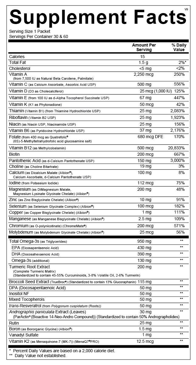 Alpha Base® Premier Packs provide a targeted combination of three high-concentration nutritional formulas in convenient, easy-to-take packets. Each pack includes Alpha Base® Capsules without Iron, a hypoallergenic, comprehensive, high-quality blend of bioavailable vitamins and minerals. Orthomega® 820 is also included and contains 430 mg of eicosapentaenoic acid (EPA), 390 mg of docosahexaenoic acid (DHA) and 50 mg of docosapentaenoic acid (DPA) omega-3 fatty acids per soft gel. Finally, each pack includes Resvoxitrol, a unique combination of phytonutrients, including the Complete Turmeric Matrix, designed to enhance antioxidant potential and maintain normal inflammatory balance in the body.
